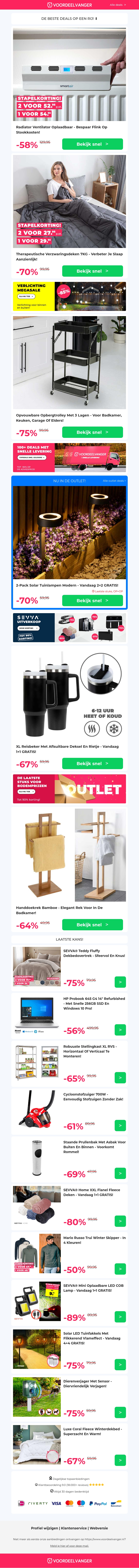 Deze nieuwsbrief van Voordeelvanger biedt enorme kortingen op populaire huishoudproducten zoals radiator ventilatoren, verzwaringsdekens, en meer. Bespaar tot wel 58% en ontdek speciale deals zoals 1+1 gratis op reisbekers. Mis deze kans niet om uw huis efficiΓ«nter en comfortabeler te maken met onze voordelige aanbiedingen.