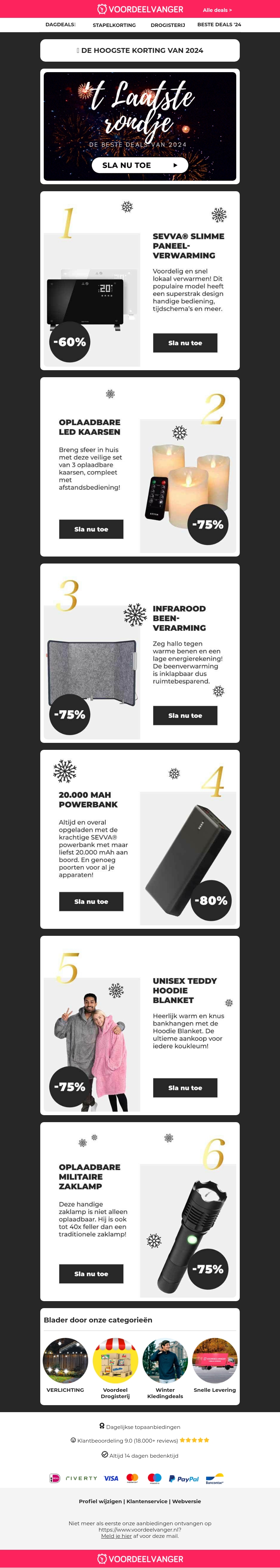 Bekijk de nieuwste en voordeligste deals van 2024. Deze nieuwsbrief bevat geweldige kortingen op slimme panelverwarming, oplaadbare LED-kaarsen, infrarood beenverwarming, krachtige powerbanks, unisex teddy hoodies en oplaadbare militaire zaklampen. Profiteer vandaag nog van deze exclusieve aanbiedingen!