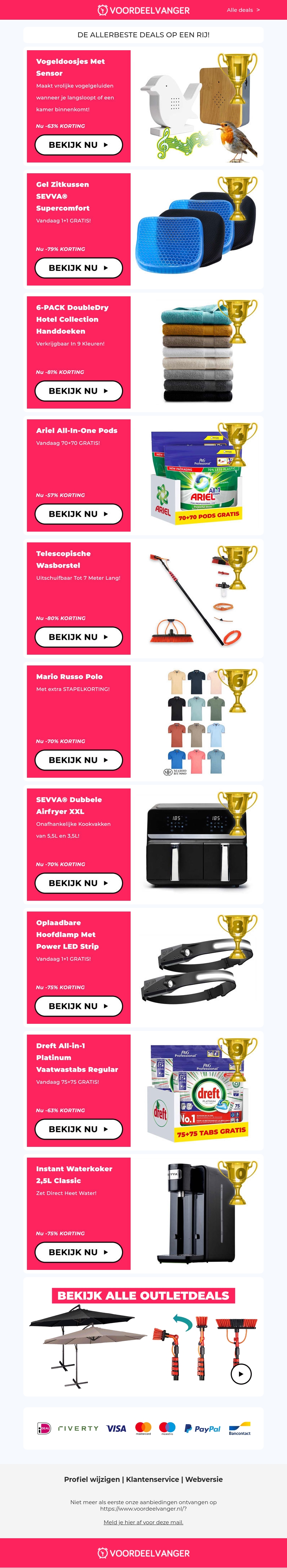 Bekijk de beste deals van Voordeelvanger, inclusief vogelvoederhuisjes, comfortabele gel zitkussens en Ariel All-in-One Pods met kortingen tot wel 89%. Profiteer vandaag nog van deze geweldige aanbiedingen!