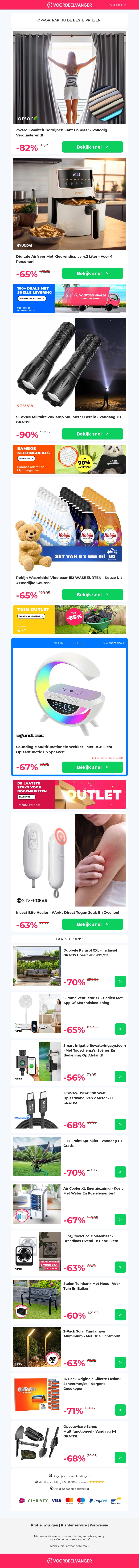 Profiteer van geweldige kortingen op een breed scala aan producten, waaronder 100% verduisterende gordijnen, digitale airfryers, militaire zaklampen, Robijn wasmiddel en de Bite Healer. Ontvang tot wel 90% korting en ontdek nu de aanbiedingen.