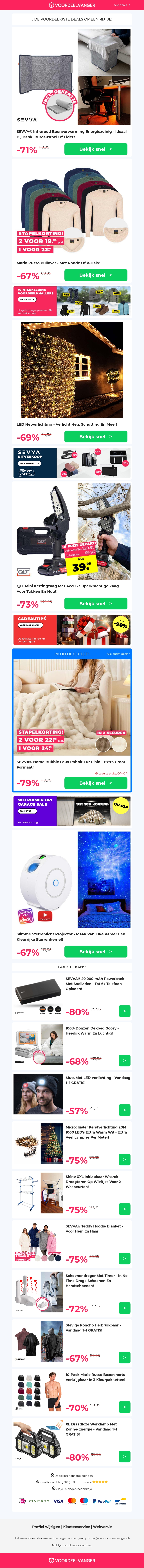 Deze week bieden we geweldige kortingen tot wel 80% op een breed scala aan producten! Ontdek de infraroodbeenverwarming met 71% korting, geniet van stapelkortingen op pullovers en versier je huis met netverlichting. Ook vind je een accukettingzaag en een betoverende sterrenlichtprojector met aanzienlijke kortingen.