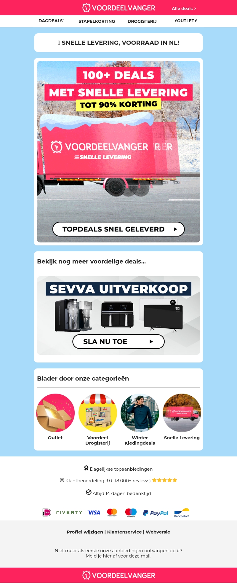Mis deze kans niet op meer dan 100 geweldige deals met kortingen tot 90% bij Voordeelvanger. Geniet van snelle levering en ontdek ons gevarieerde aanbod van producten. Van dagelijkse benodigdheden tot winterkleding, er is voor ieder wat wils. Blader door onze categorieën zoals Outlet en Snelle Levering voor de beste koopjes. Klantbeoordeling van 9.0 uit meer dan 18.000 reviews, met 14 dagen bedenktijd. Shop veilig met verschillende betaalopties.