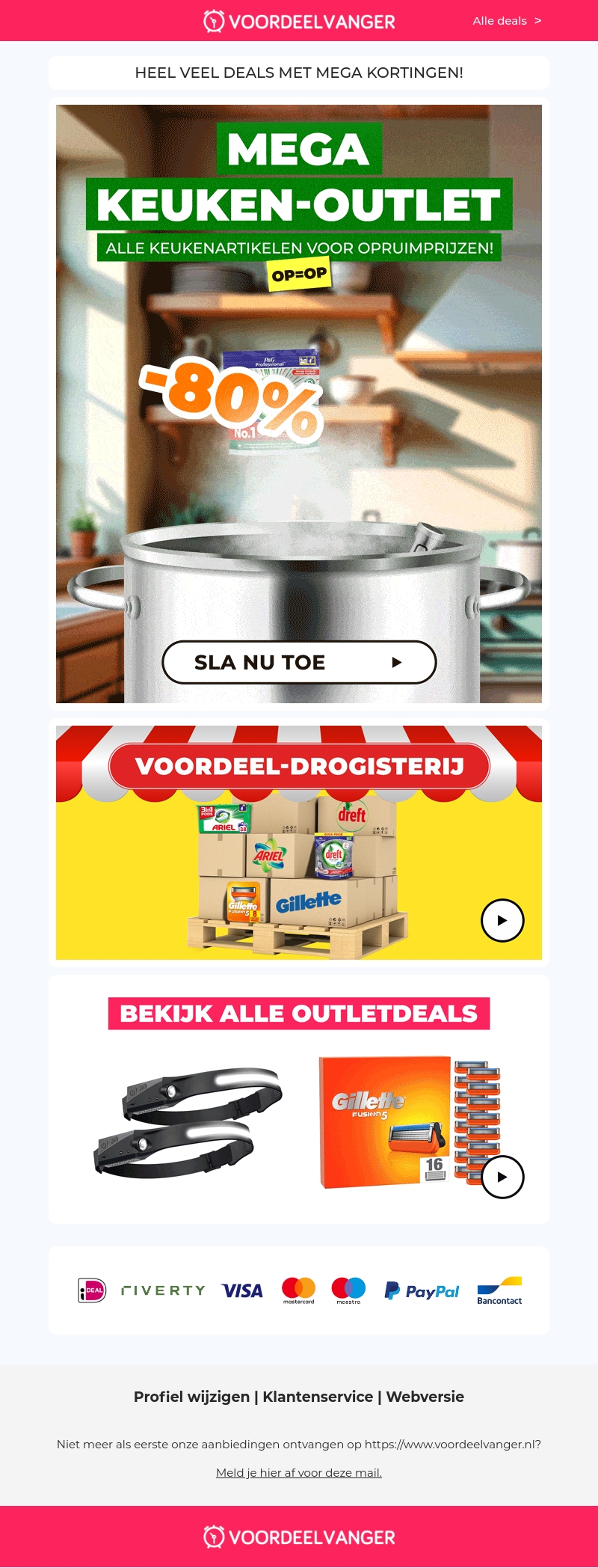 Bezoek de Mega Keuken-Outlet en bespaar groot op al je favoriete keukenartikelen. Met kortingen tot 80% is dit de laatste kans om geweldige aanbiedingen te scoren. Mis deze kans niet om je keuken te upgraden met premium merken. Inclusief voordeel op bekende merken zoals Ariel en Dreft. Geldig zolang de voorraad strekt, dus sla nu toe.