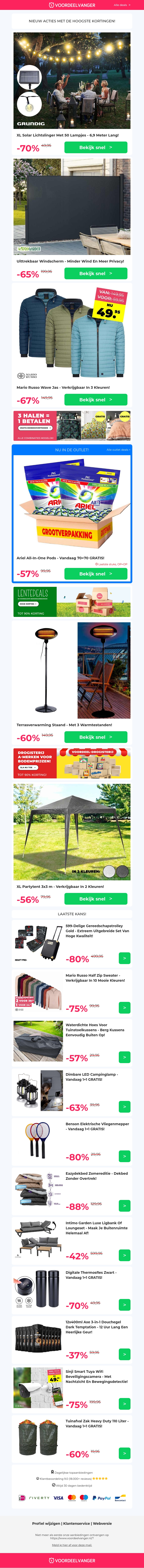 Profiteer van kortingen tot 88% op diverse producten, waaronder lichtslingers, uittrekbare wind- en privacyschermen, de Wave Jas, terrasverwarmers, en partytenten. Haal de beste deals binnen terwijl de voorraad strekt. Mis deze kans niet en geniet van de hoogste kortingen!