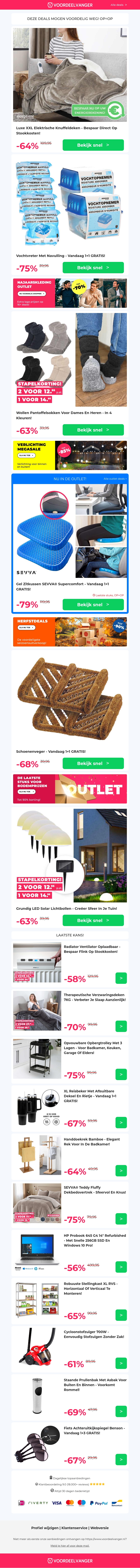 Ontdek geweldige kortingen op diverse producten zoals de XXL elektrische knuffeldeken, vochtvreters met een 1+1 gratis actie, en warme pantoffelsokken. Daarnaast zijn er ook voordelige schoenenvegers en sfeervolle solar lichtbollen in de aanbieding. Mis de kans niet om te profiteren van deze deals. Verfris je woon- en leefruimte met de beste koopjes van het seizoen.