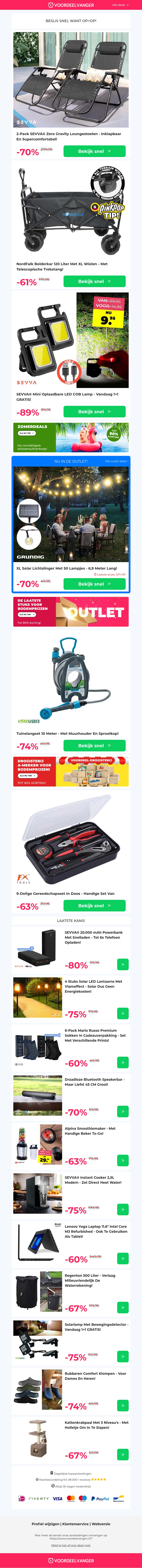 Deze week hebben we mega kortingen op verschillende producten. Bespaar 70% op 2x SEVYAA Zero Gravity Loungestoelen en krijg 61% korting op de HomFami bolderkar. Ook zijn er geweldige deals op gereedschapssets, mini lampen, en tuinslangen. Mis de kortingen niet en shop nu!