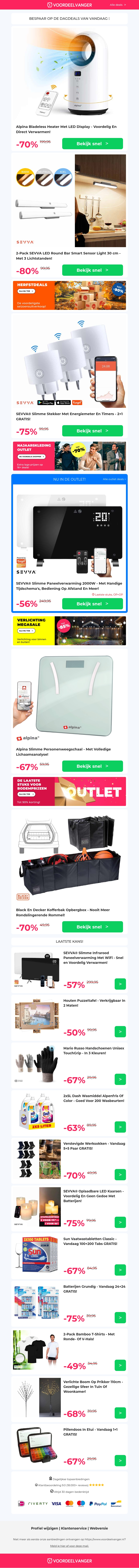 Beleef de ultieme koopjes met kortingen tot wel 80%! Onze nieuwsbrief brengt je geweldige aanbiedingen op de Bladeless Heater, sensorlichten en energiemeter stekker. Perfect voor het upgraden van je huis tijdens de koude maanden. Ontvang ook voordelige prijzen op weegschalen en een handige kofferbak organizer. Mis deze beperkte tijdsacties niet!