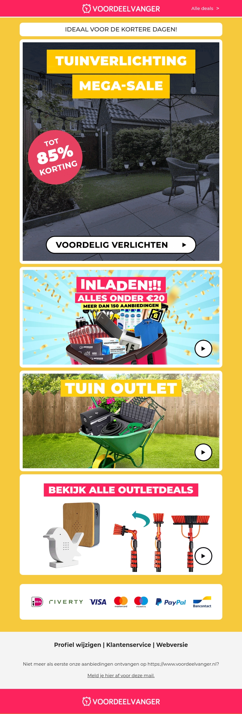 Mis het niet! Onze mega-sale op tuinverlichting biedt kortingen tot 85%. Daarnaast vindt u in onze tuin outlet meer dan 150 artikelen onder β¬20. Bekijk nu alle outletdeals en verlicht uw tuin voordelig!