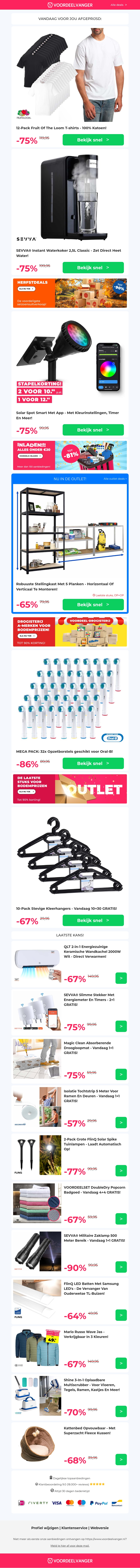 Profiteer van fantastische aanbiedingen zoals 12 Fruit of the Loom T-Shirts met 75% korting, instant waterkokers, solar spot verlichting en opzetborstels voor Oral-B tandenborstels. Mis ook de stevige en praktische kleerhangers niet. Koop nu en bespaar groots!