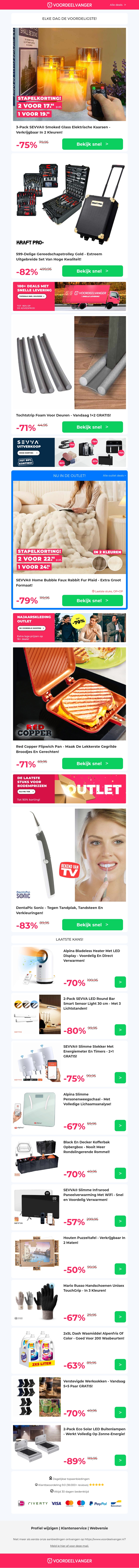 Profiteer van mega kortingen op onze producten! Elektrische kaarsen, een gereedschapstrolley, anti-tochtstrips en meer zijn nu sterk afgeprijsd. Mis deze kans niet om te besparen op essentiΓ«le items voor jouw huis. Ontdek ook de Flipwich Pan en Dentapic Sonic voor unieke keuken- en tandverzorging.