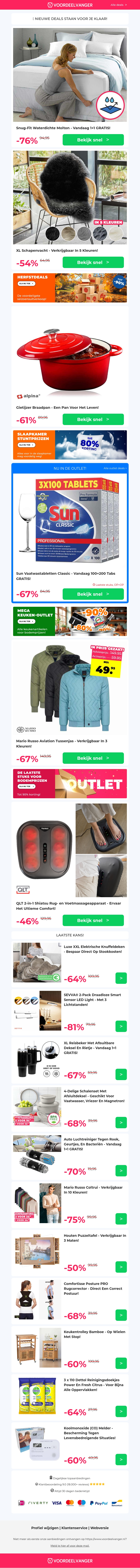 Profiteer nu van exclusieve aanbiedingen zoals een waterdichte Molton 1+1 gratis, en diverse andere producten met hoge kortingen! Van warme tussenjassen van Mario Russo tot ontspannende Shiatsu massageapparaten, er is voor ieder wat wils. Mis deze kans niet om te besparen op je favoriete items!