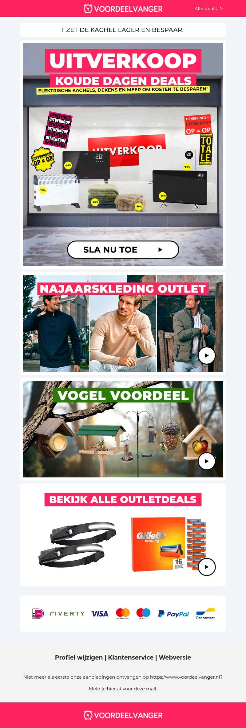 Mis de kans niet om te besparen met onze uitverkoop voor koude dagen! Geniet van scherpe kortingen op elektrische kachels, warme dekens en meer essentiële producten om de winter door te komen. Bezoek ons online outletcentrum en ontdek kledingdeals, vogelvoordeel en veel meer. Sla nu toe en bespaar groots!
