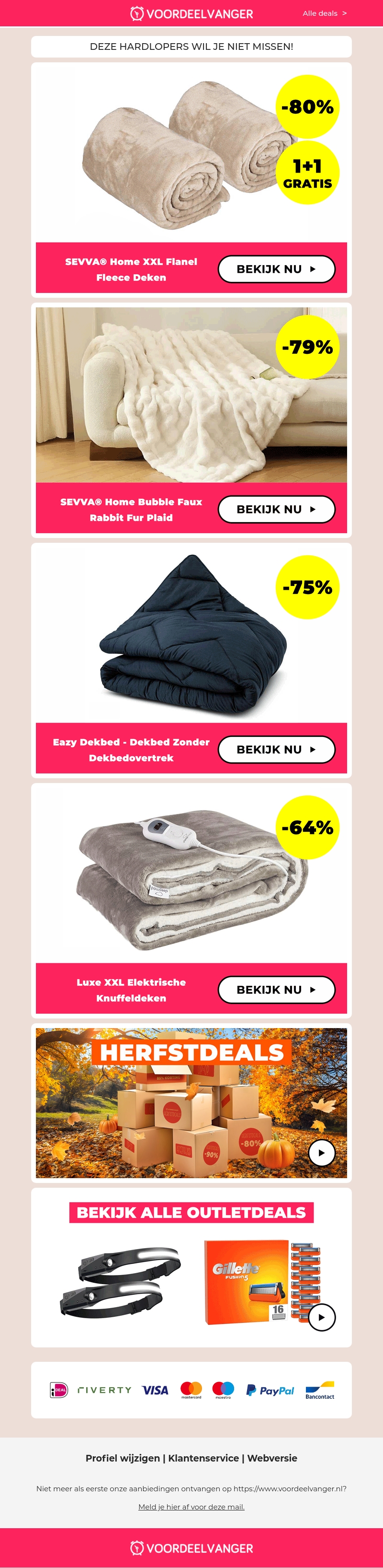 Ontdek de geweldige aanbiedingen op diverse dekens bij Voordeelvanger. Bespaar tot 80% op onze selectie van flanellen en elektrische dekens. Mis het populaire 1+1 gratis aanbod niet. Perfect voor warme en gezellige avonden in de herfst. Bekijk alle outletdeals nu en geniet van enorme kortingen.
