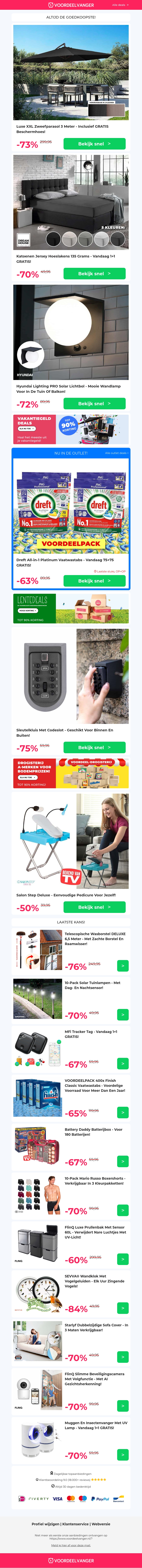 In deze nieuwsbrief vind je geweldige kortingen op verschillende producten, van luxe parasols tot hoogwaardige schoonmaakmiddelen en handige gadgets. Mis de kans niet om te besparen tot wel 84%! Ontvang vandaag gratis cadeau's bij geselecteerde items. Bekijk snel onze aanbiedingen en pak jouw voordeel.
