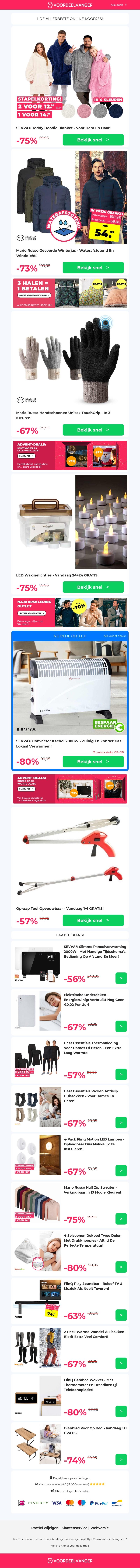Profiteer van geweldige kortingen op onze top aanbiedingen zoals Teddy Hoodies en waterdichte winterjassen. Maak je winter compleet met handige accessoires zoals Touchgrip handschoenen en sfeervolle LED theelichten. Bezoek onze website voor nog meer verrassingen en mis deze kans niet om je favorieten voor minder te scoren.