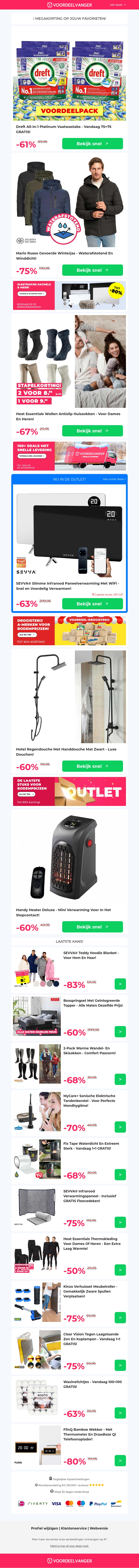 Mis deze winterse aanbiedingen niet! Scoor Dreft Tabs met een 75+75 gratis deal. Bereid je voor op de kou met Mario Russo Winterjassen en comfortabele wollen huissokken. Upgrade je badkamer met een luxe regendouche en verwarm je ruimte met de handige Handy Heater.