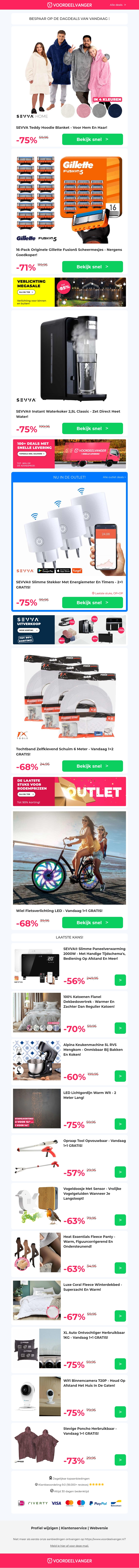 AANBIEDING: Warme Hoodie Blanket -75% / 16x Fusion5 Scheermesjes / Instant Waterkoker / Anti-Tochtband / Wiel Verlichting