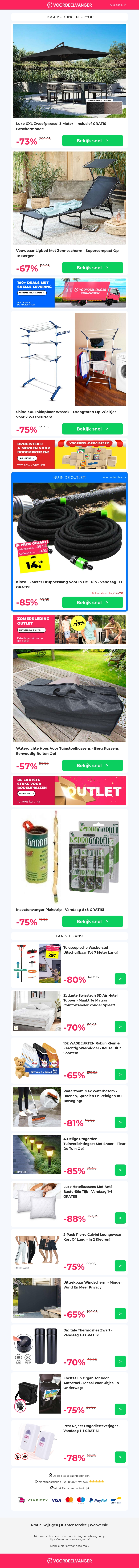 Profiteer van hoge kortingen op diverse tuin- en huishoudartikelen. Bespaar tot wel 85% op zweefparasols, vouwbare ligbedden, wasrekken, tuinstoelkussenhoezen en meer. Bekijk onze speciale aanbiedingen en grijp je kans om kwalitatieve producten voor een fractie van de prijs aan te schaffen. Mis het niet!