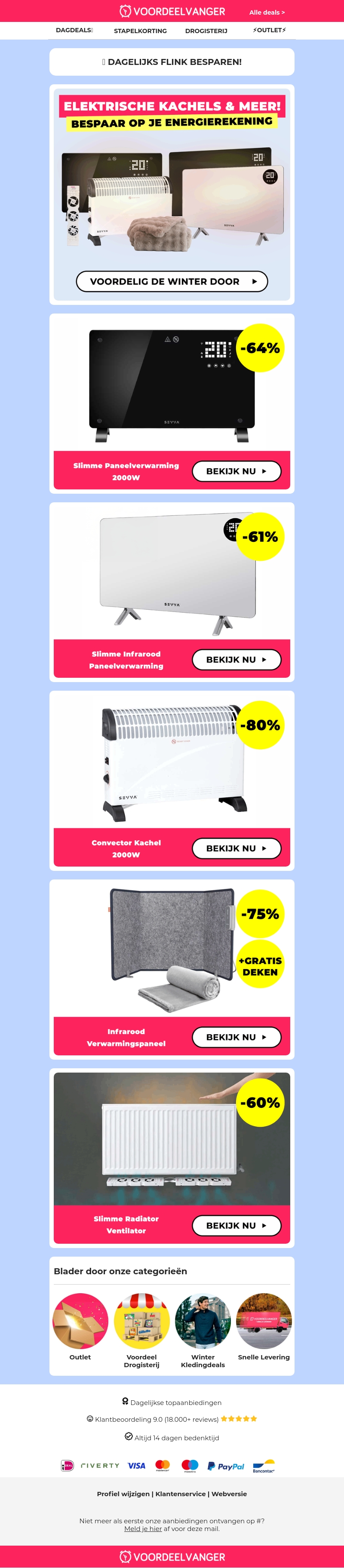 Verlaag je energierekening met onze grote kortingen op elektrische kachels en panelen. Van slimme paneelverwarming tot infraroodopties, er is voor elk wat wils. Mis deze kans niet om comfortabel de winter door te komen zonder je budget te overschrijden. Profiteer nu van kortingen tot wel 80%. Bekijk ons volledige assortiment voor de beste deals. Gratis dekens bij geselecteerde producten.