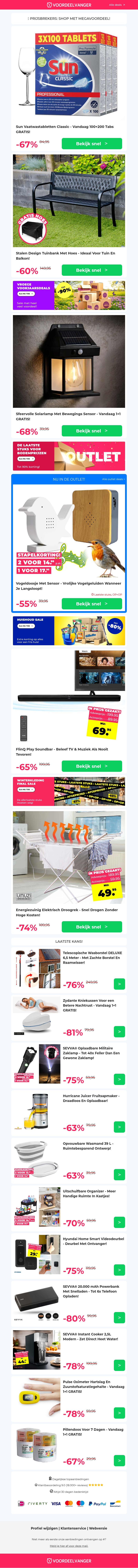 Deze nieuwsbrief staat boordevol aanbiedingen: Sun vaatwastabletten 300 stuks voor de prijs van 100, een elegante design tuinbank, en een afgeprijsde soundbar. Profiteer ook van solarlampen en elektrische droogrekken. Bezoek nu de website voor meer informatie en exclusieve kortingen.
