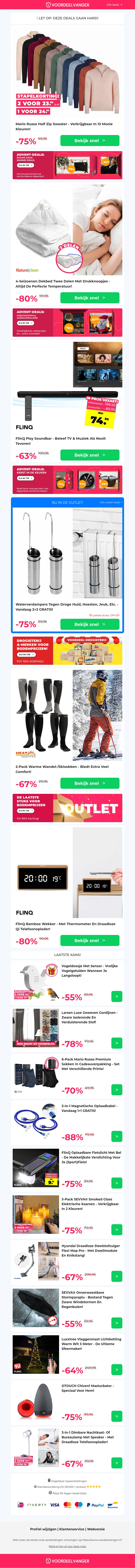 Deze nieuwsbrief biedt ongelooflijke kortingen op populaire producten, waaronder een Half Zip Trui met 75% korting en een 4-seizoenen dekbed. Geniet ook van aanbiedingen op soundbars, warme sokken en een bamboe wekker. Perfect voor een gezellige winter en om je huis te voorzien van de nieuwste gadgets.