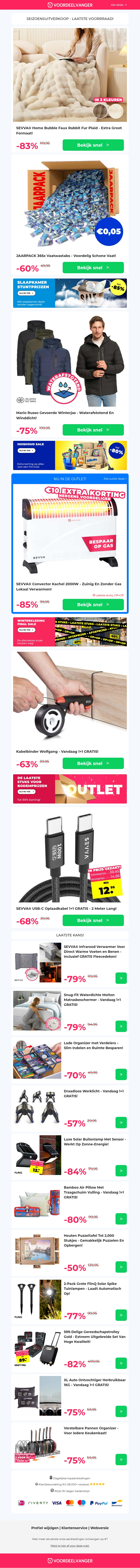 Geniet van grote kortingen op diverse items zoals de luxe plaid, jaarpack vaatwastabletten en een gevoerde winterjas. Bespaar nu op de kabelbinders en ontvang een gratis extra oplaadkabel. Pak deze kans om je essentiΓ«le benodigdheden tegen een gereduceerde prijs te krijgen.