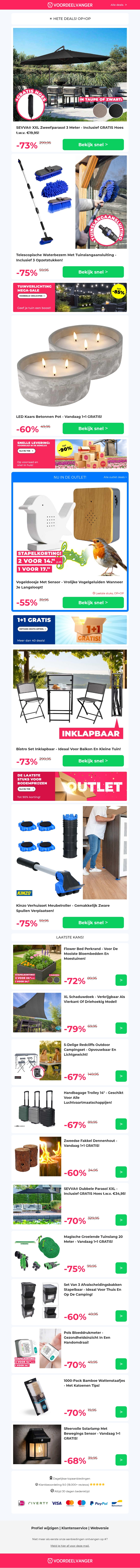 Mis 'm niet π₯π‘οΈ 73% KORTING op XXL Zweefparasol / Telescopische Waterbezem / LED Kaars 1+1 / Bistro Set / Verhuisset