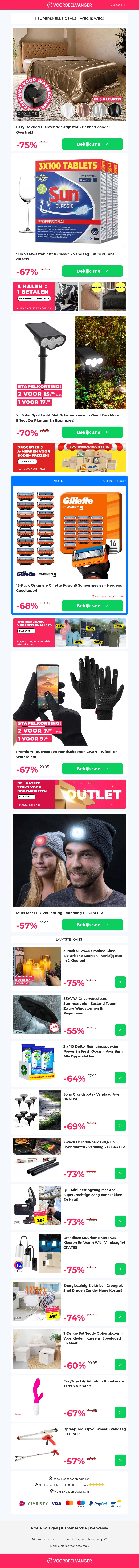 Ontdek de nieuwste aanbiedingen met hoge kortingen op een Eazy satijn dekbed, Sun Classic Tabs, XL Solar Spotlight, waterdichte handschoenen, en een muts met LED verlichting. Van slaapkamercomfort tot praktische gadgets voor dagelijks gebruik, er is voor ieder wat wils. Mis deze kans niet om kwaliteitsproducten tegen voordelige prijzen aan te schaffen.