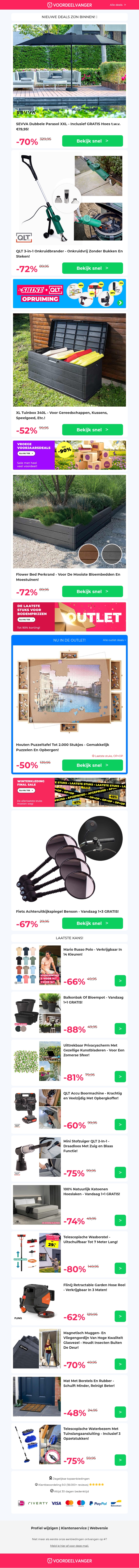 Mis deze geweldige kortingen niet! Ontdek de dubbele Parasol XXL, een efficiΓ«nte onkruidbrander, handige tuinbox en stijlvolle tuinlampen. Perfect voor op je terras of in de tuin. Profiteer van de laatste aanbiedingen en verbeter je buitenruimte vandaag!