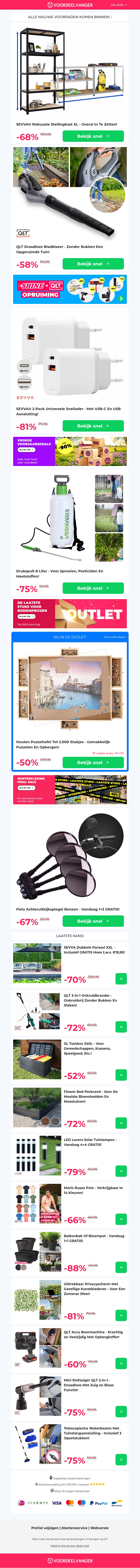 Verken onze nieuwe voorraad met hoge kortingen op diverse producten zoals de robuuste stellingkast XL, multifunctionele bladblazer en universele snellader. Mis de kans niet om hoogwaardige drukspuiten en fiets achteruitkijkspiegels te bemachtigen. Profiteer van de aanbiedingen en verbeter je huis en tuin met deze essentials.