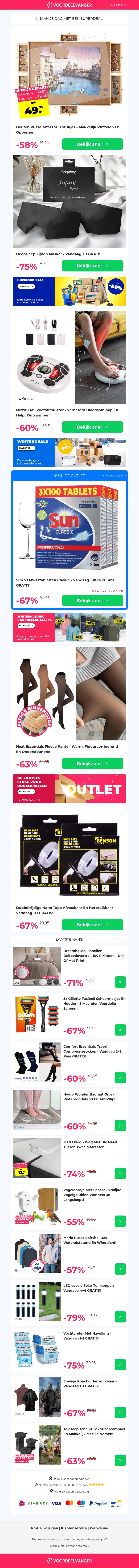 Deze nieuwsbrief biedt geweldige aanbiedingen, zoals een puzzeltafel voor 1500 stukjes met 10 euro extra korting, zijden slaapmaskers met 1+1 aanbieding en meer. Ontdek ook de EMS voetstimulator en comfortabele fleece panty's. Mis deze unieke kansen niet!