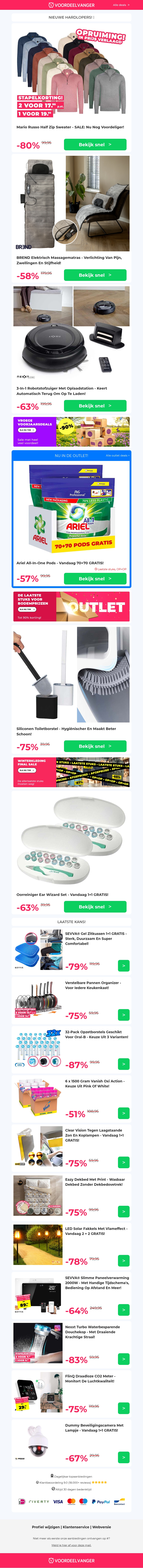 Bezoek Voordeelvanger voor de beste aanbiedingen van dit seizoen! Bespaar op stijlvolle Halve Zip Sweaters met stapelkorting, geniet van ontspanning met ons Elektrisch Massagematras, en laat de 3-in-1 Robotstofzuiger het zware werk voor je doen. Daarnaast zijn er praktische huishoudelijke gadgets zoals toiletborstels en oorreinigers. Profiteer van de 1+1 gratis aanbieding!