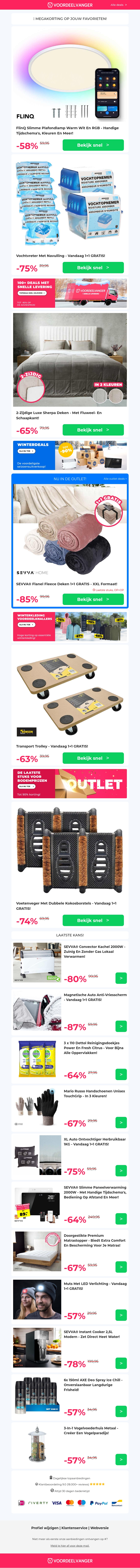 Beleef de beste deals met ongekende kortingen op diverse producten zoals plafondlampen, vochtvreters, Sherpa dekens, en transporttrolleys. We bieden zelfs 1+1 gratis acties! Mis ook de korting op voetenvegers niet. Vernieuw je huis en bespaar tegelijkertijd met deze geweldige aanbiedingen.