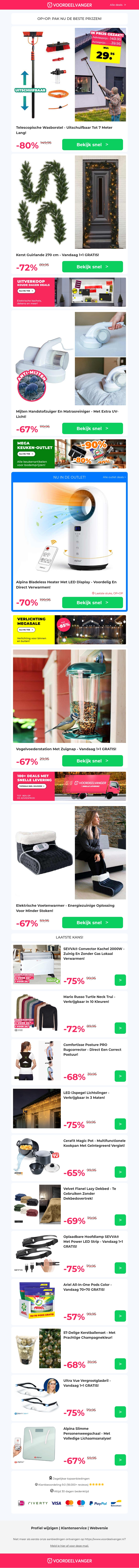 Profiteer van grote kortingen op onze telescopische wasborstel met 80% korting. Mis de kans niet op onze Kerst Guirlande met een 1+1 aanbieding en een handige mijten handstofzuiger. Geniet bovendien van onze vogelvoederstation 1+1 aanbieding en houdt uw voeten warm met onze comfortabele voetenwarmer.