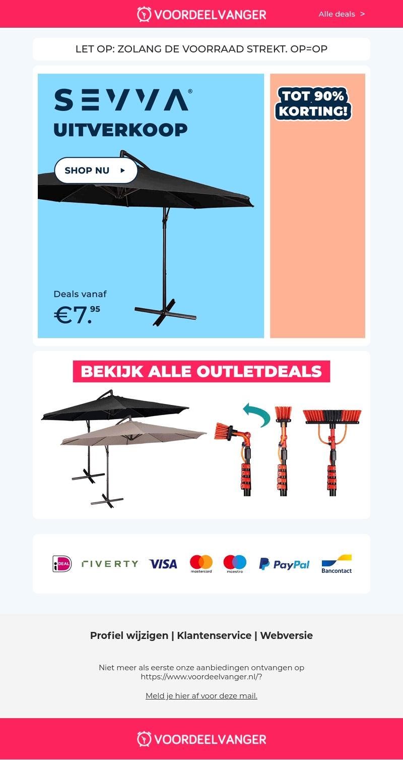 Welkom bij onze grootste uitverkoop van het jaar! Ontvang tot 90% korting op geselecteerde Sevva producten, inclusief prachtige parasols en andere buitenartikelen. Mis deze unieke kans niet om te genieten van geweldige deals.