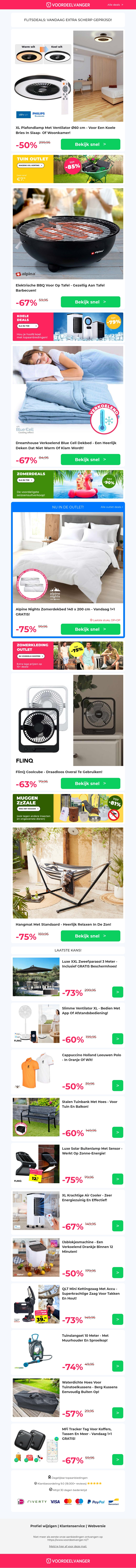 Mis deze geweldige aanbiedingen niet! Vandaag profiteer je van 50% korting op diverse producten waaronder een XL ventilator plafondlamp, een handige elektrische BBQ, een verkoelend dekbed, de Coolcube en een comfortabele hangmat met standaard. Zorg dat je snel bent, want op is op!