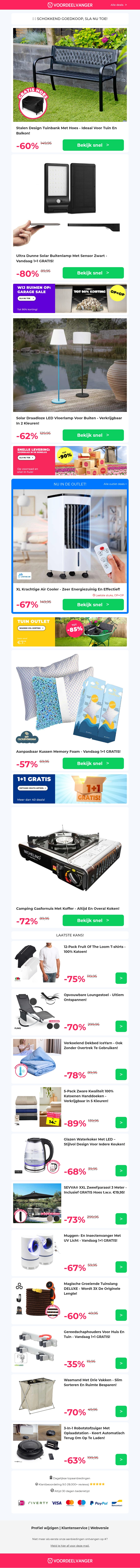Profiteer deze lente van geweldige kortingen op tuinmeubels en accessoires. Bespaar 60% op een stijlvolle stalen tuinbank. Ontvang een ultra dunne solar lamp met een 1+1-deal. Verlicht je outdoor ruimte met een moderne vloerlamp en geniet van de voordelen van een aanpasbaar kussen met een 1+1-aanbieding. Bovendien is er een praktisch camping gasfornuis met extra korting. Mis deze kans niet om je tuin in stijl in te richten!
