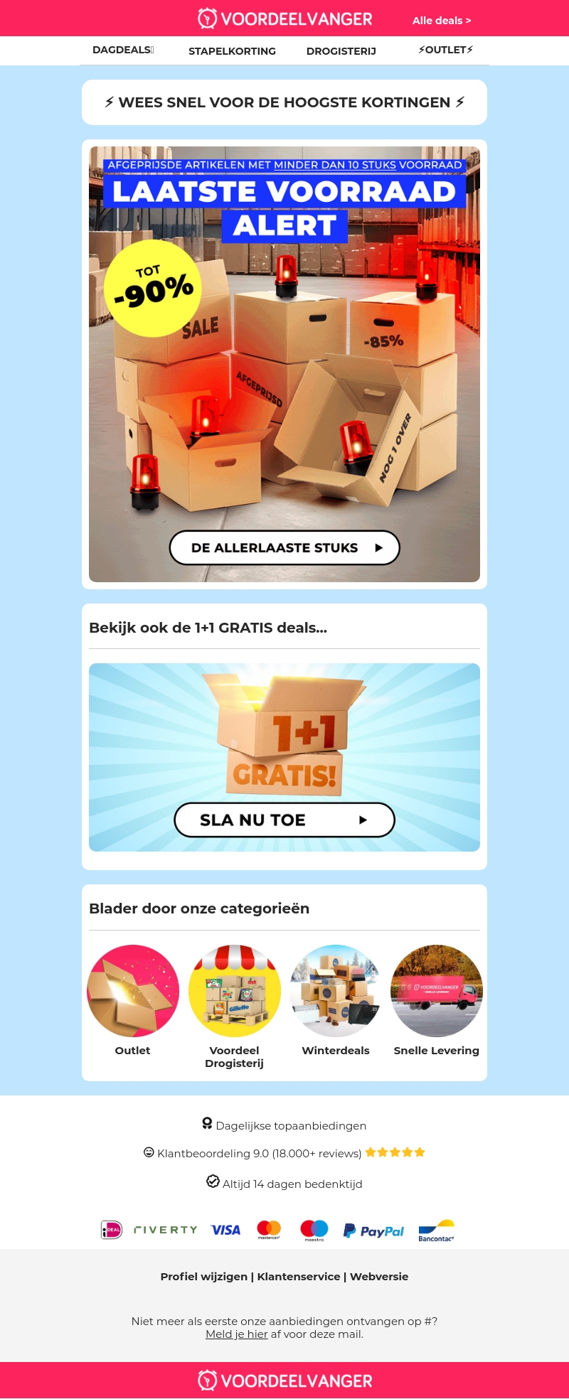 Ontdek de beste deals met de aller-laagste prijzen in onze laatste voorraad actie. Met kortingen tot wel 90% bespaar je enorm op diverse producten. Vergeet niet om ook onze 1+1 gratis aanbiedingen te bekijken. Deze deals zijn beperkt en het is echt OP=OP! Bezoek onze website nu en profiteer van deze geweldige aanbiedingen.