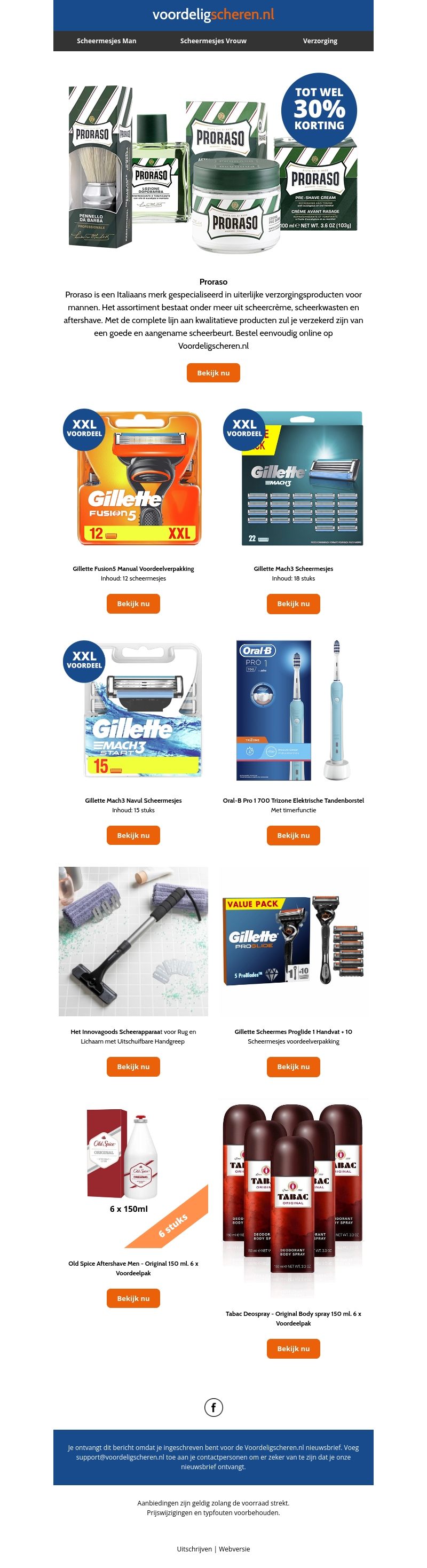 Ontdek geweldige aanbiedingen op Gillette en Proraso scheerproducten bij Voordeligscheren.nl. Bespaar tot wel 30% op topmerken. Kies uit een breed assortiment scheermesjes, aftershave en lichaamsverzorgingsproducten. Mis deze kans niet om van scherpe prijzen te profiteren!
