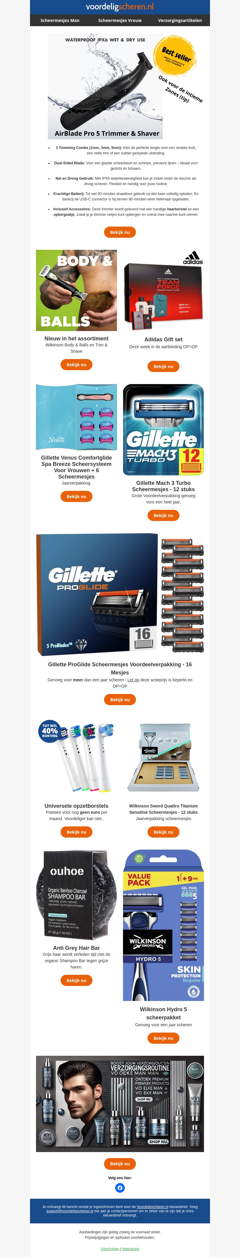 Deze nieuwsbrief biedt een ruim assortiment aan scheermesjes en verzorgingsproducten voor mannen. Ontdek topmerken zoals Gillette en Wilkinson en profiteer van exclusieve aanbiedingen en jaarpakketten. Of je nu houdt van elektrisch of handmatig scheren, er is voor ieder wat wils. Bekijk nu de scherpste deals en vernieuw je verzorgingsroutine. Shop slimme combinaties en geniet van volumekorting!