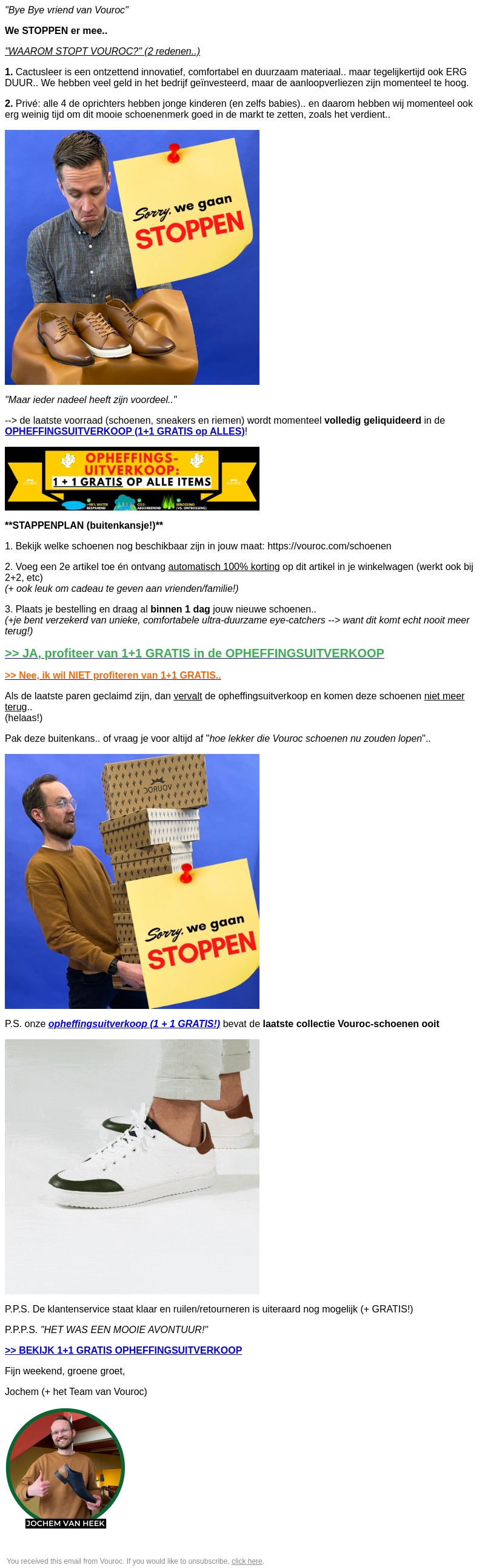 Vouroc stopt ermee en houdt een grote opheffingsuitverkoop. Ontdek de redenen achter deze beslissing en hoe je kunt profiteren van de gigantische kortingen. Mis deze kans niet om unieke, comfortabele en duurzame schoenen aan te schaffen met 1+1 gratis op alle items.