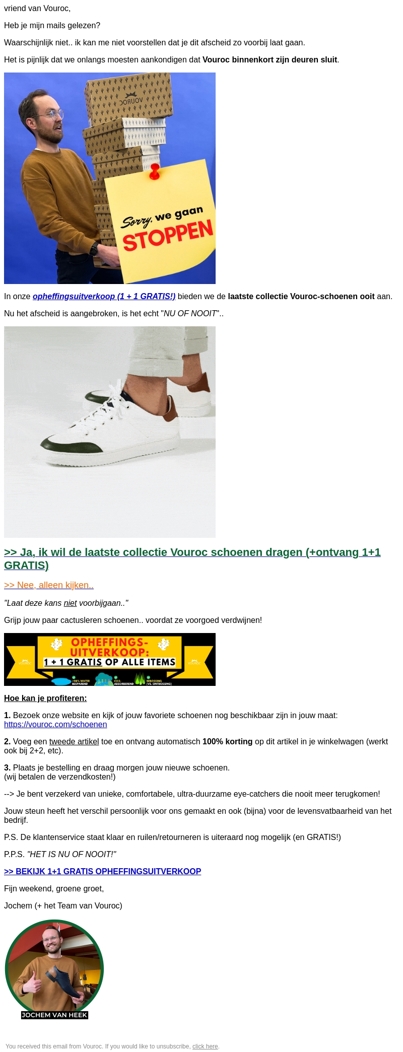 Het is pijnlijk nieuws: Vouroc sluit binnenkort zijn deuren. Mis deze unieke kans niet om nog een paar van onze speciale schoenen te bemachtigen tijdens de opheffingsuitverkoop. Bovendien ontvang je 1+1 gratis op alle items. Grijp je kans nu en profiteer van gratis verzending!