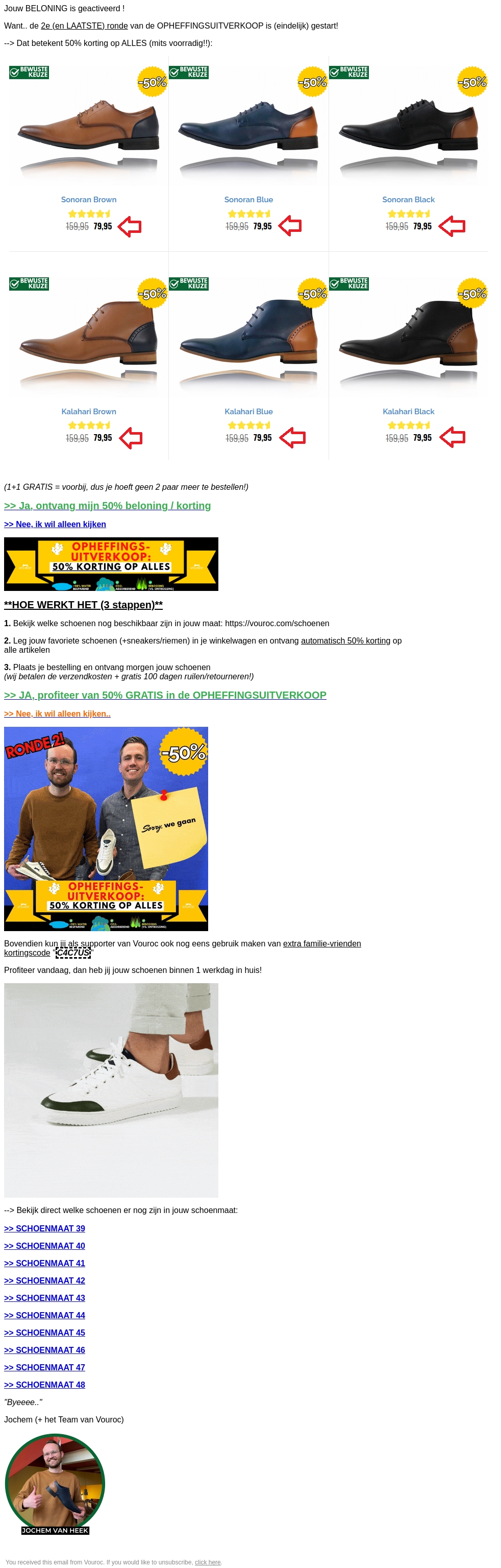 Jouw beloning is geactiveerd! De tweede en laatste ronde van de ophouingsuitverkoop bij Vouroc is begonnen. Dit betekent 50% korting op alles, zolang de voorraad strekt. Profiteer nu van deze geweldige aanbiedingen en ontvang een extra familie-vriendenkorting met de code CACTUS.