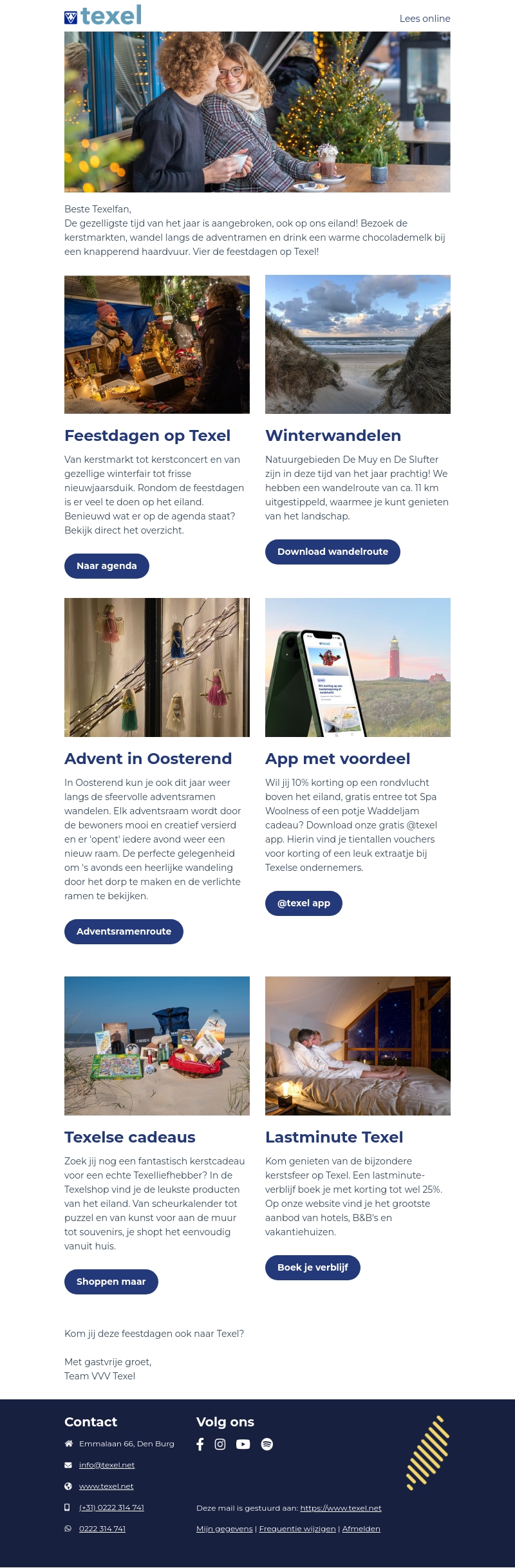 Ontdek Texel tijdens de feestdagen met gezellige kerstmarkten, sfeervolle adventsramen en prachtige winterwandelingen. Bezoek de mooiste plekken van het eiland en geniet van winterkorte vakanties. Vind unieke Texelse cadeaus in de Texelshop en profiteer van lastminute boekingskortingen tot 25%.