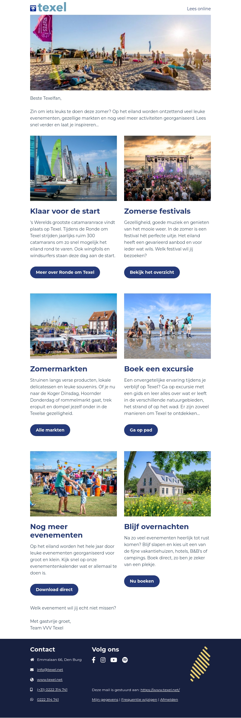 Zin om iets leuks te doen deze zomer? Texel biedt een scala aan evenementen, van catamaranraces en zomerse festivals tot markten en excursies. Ontdek het gevarieerde aanbod en plan je bezoek aan dit prachtige eiland vol activiteiten.