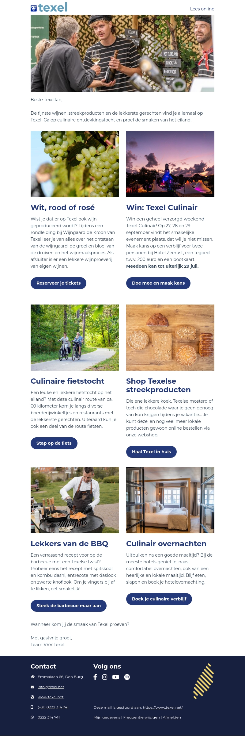 Ontdek de beste wijnen en streekproducten van Texel! Maak kans op een geheel verzorgd weekend bij Texel Culinair, verken het eiland met een culinaire fietstocht en proef lokale lekkernijen. Lees meer over onze BBQ-recepten en boek een culinaire overnachting.