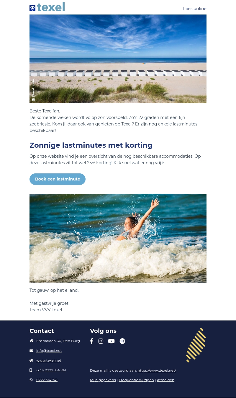 Beste Texelfan, de komende weken wordt volop zon voorspeld. Profiteer nu van lastminute deals op Texel met kortingen tot wel 25%. Kijk snel wat er nog vrij is en geniet van een heerlijk verblijf aan zee!