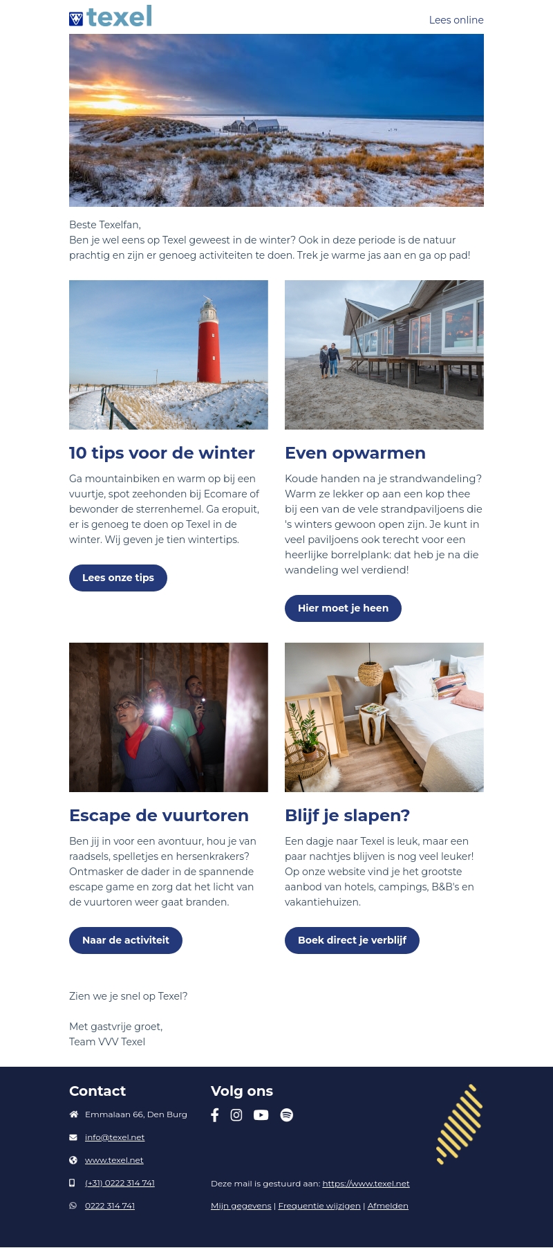 Beleef de winter op Texel met unieke bezienswaardigheden en avonturen. Ontdek 10 tips voor jouw perfecte winteruitje. Warm op bij strandpaviljoens en geniet van een kop thee of borrelplank na een wandeling. Doe mee aan spannende escape games en ontdek de charme van verblijfsmogelijkheden voor een ultieme winterervaring.