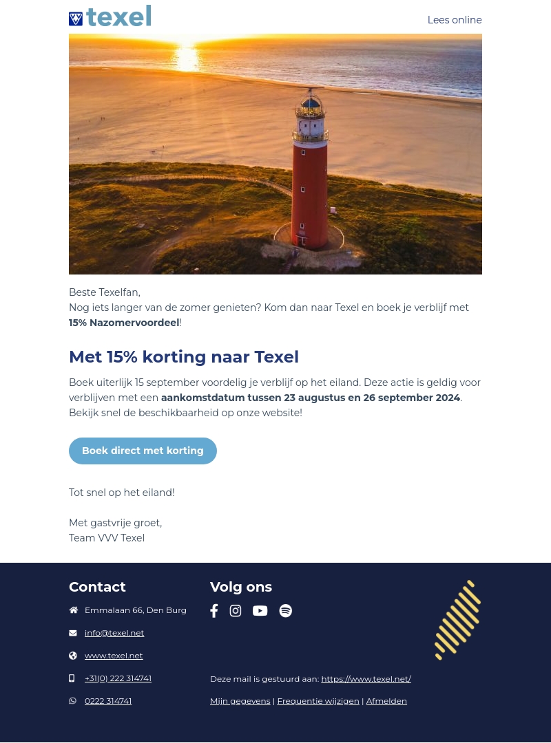 Beste Texelfan, wil je langer genieten van de zomer? Boek dan nu je verblijf op Texel met 15% korting! Deze actie is geldig voor verblijven met een aankomstdatum tussen 23 augustus en 26 september 2024. Tot snel op Texel!