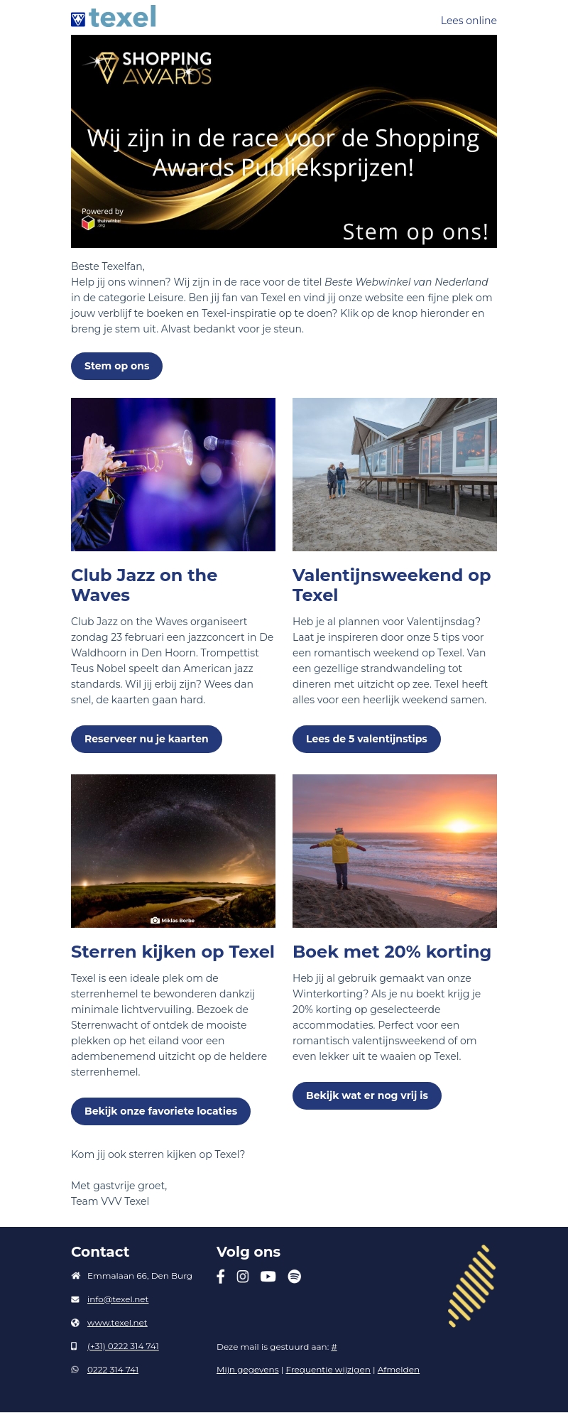 Help Texel winnen bij de Shopping Awards. Stem op ons en ontdek een scala aan activiteiten zoals sterren kijken en jazzconcerten op het eiland. Geniet van een Valentijnsweekend met onze tips en boek met 20% korting.